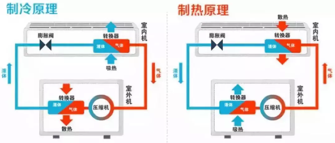 而空調(diào)之所以可以源源不斷地輸送“暖氣”或“冷氣”,就是因?yàn)橐簯B(tài)的制冷劑繼續(xù)通過管道流向室外的交換器,變成氣體,再進(jìn)入室內(nèi),形成一個循環(huán)。